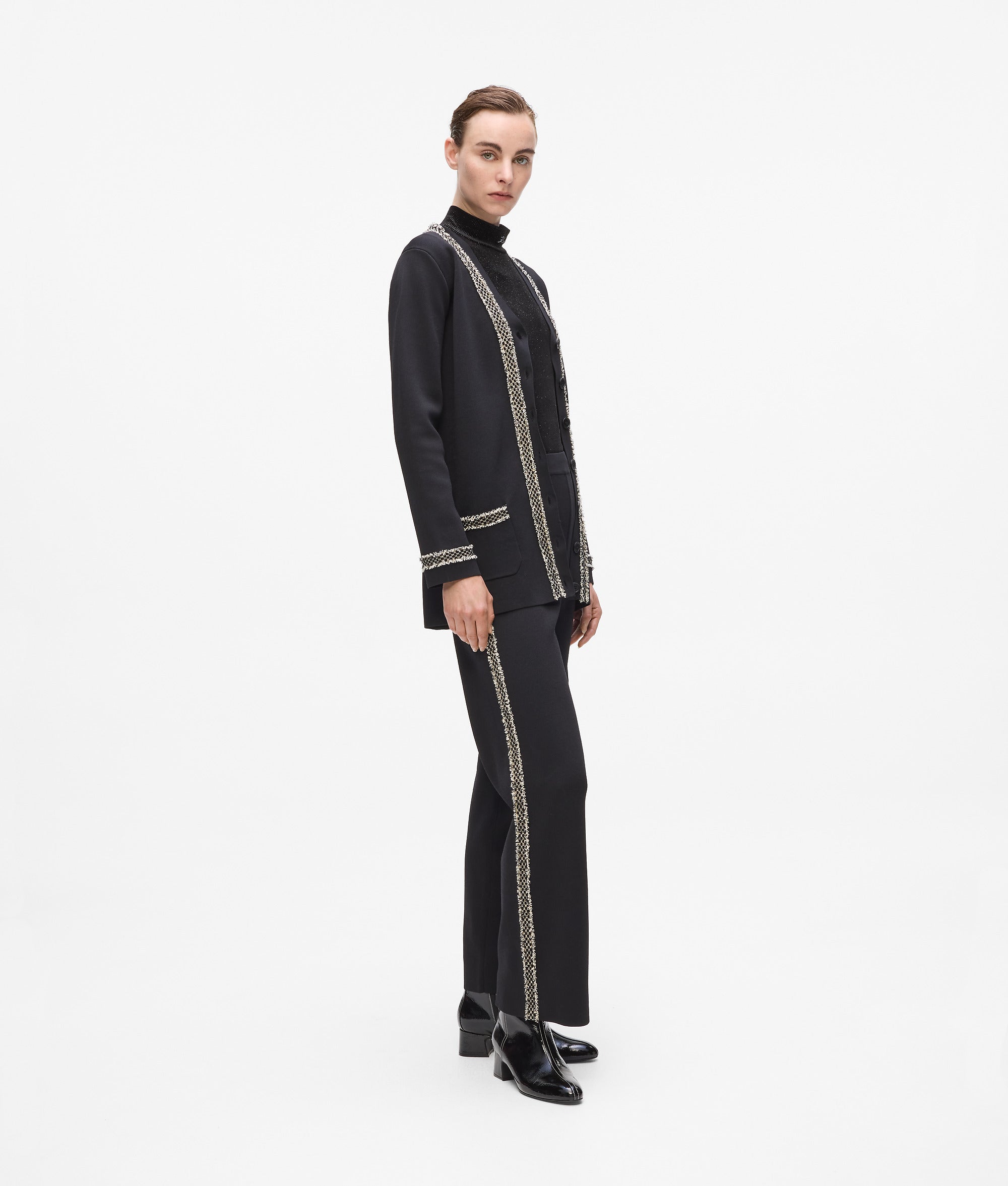 These knitted pants feature textured boucl?? accents along the outer seams. adding a tactile edge. A Signature logo charm at the waistband brings subtle branding.?