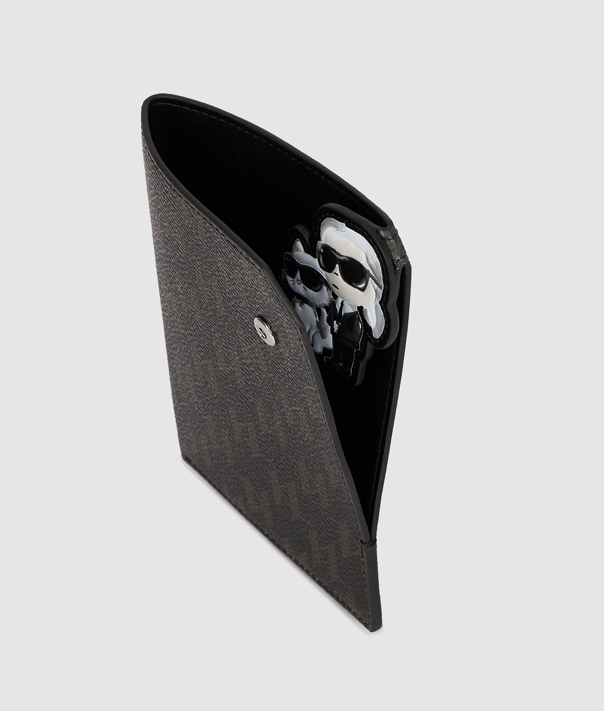 Elevate your travel essentials with this bifold passport holder. blending playful Ikon Karl and Choupette artwork with an elegant all-over KL Monogram design.