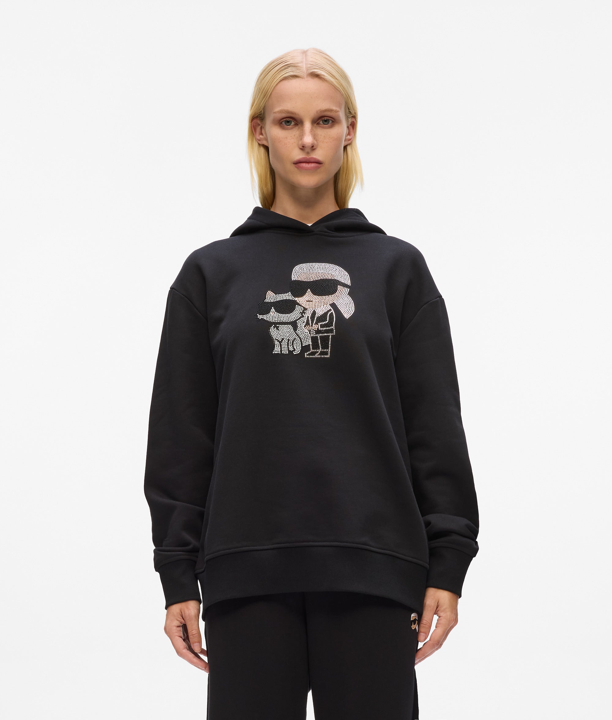This off-duty highlight is made from cozy organic cotton and features a hooded silhouette for relaxed comfort. Rhinestone artwork of Ikon Karl and Choupette add a playful. sparkling touch to this essential hoodie.