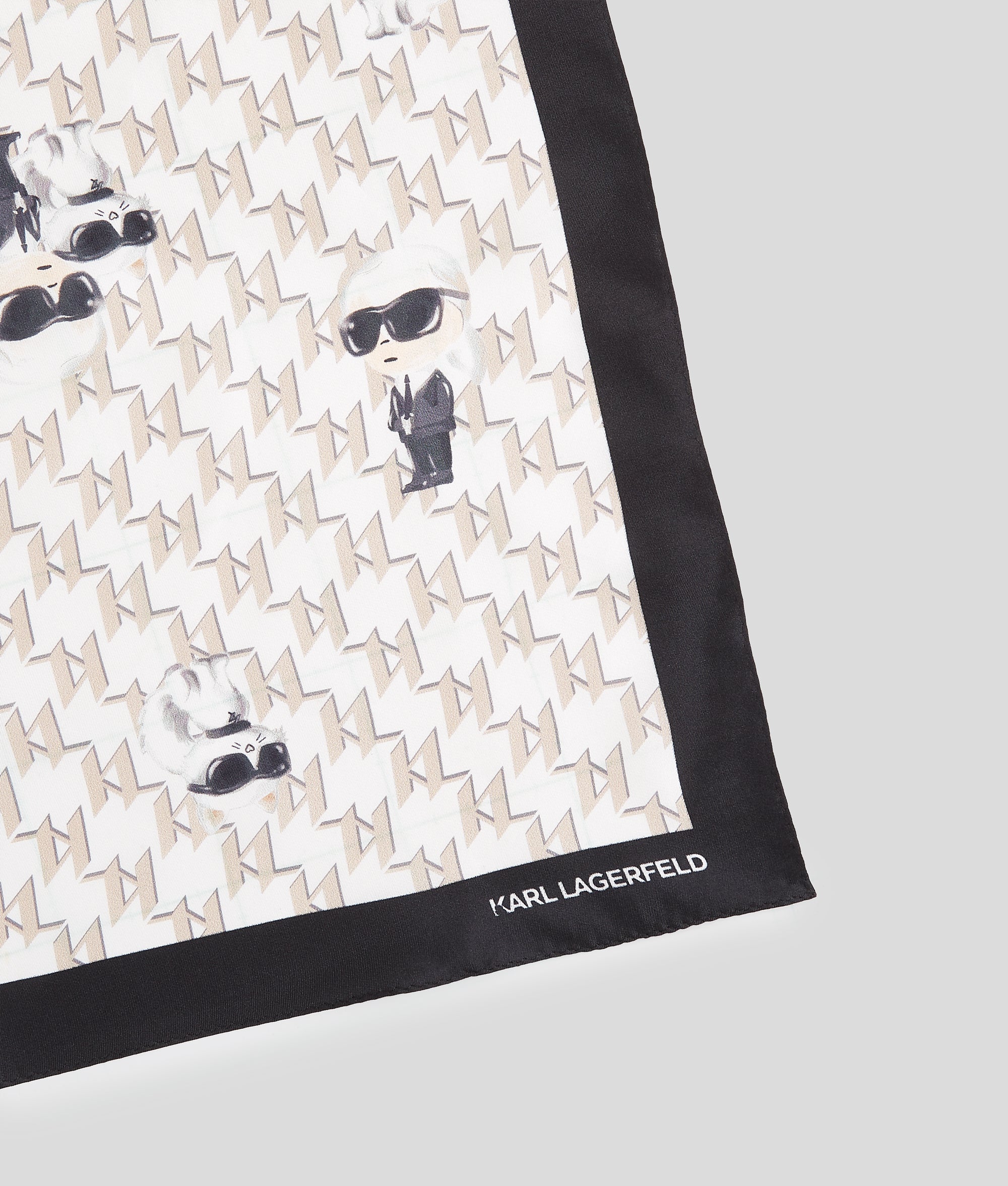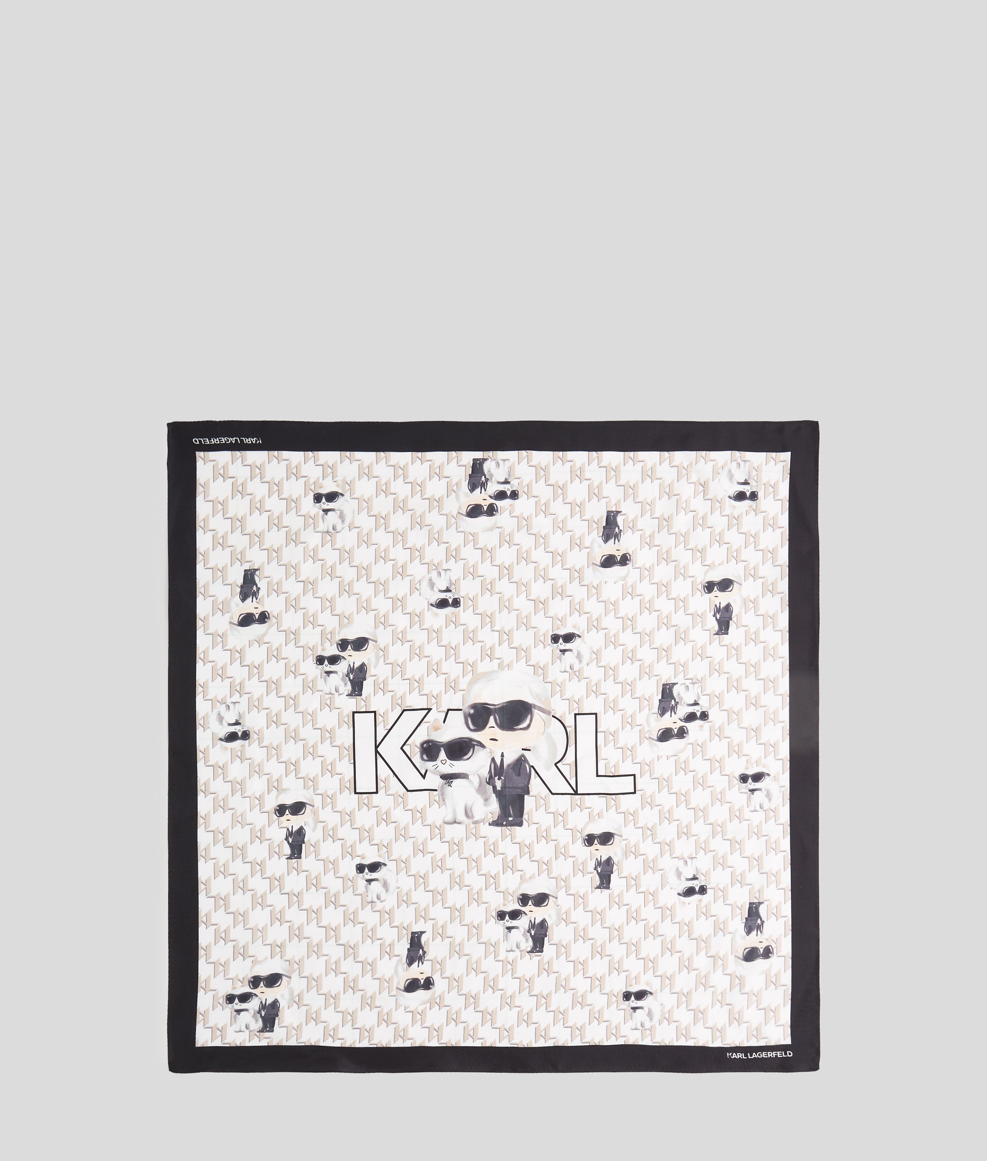 An elegant square silhouette in luxurious silk. this scarf showcases a playful all-over print featuring Ikon Karl and Choupette. Framed by a contrasting border featuring the KARL LAGERFELD logo. it adds a chic touch to any ensemble.