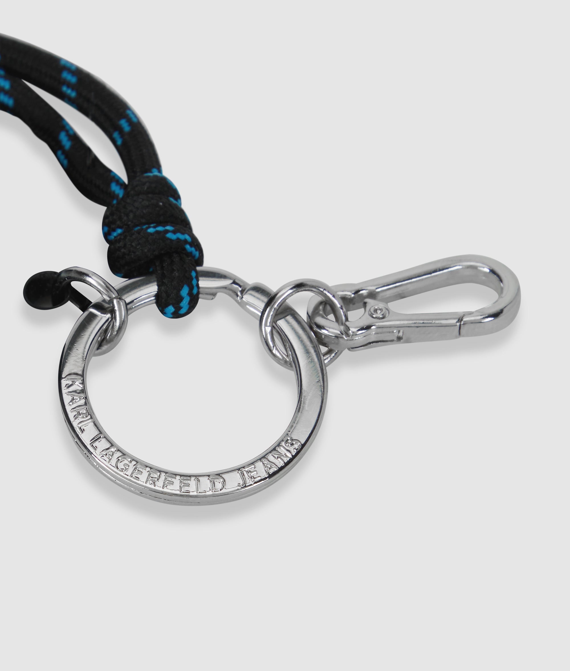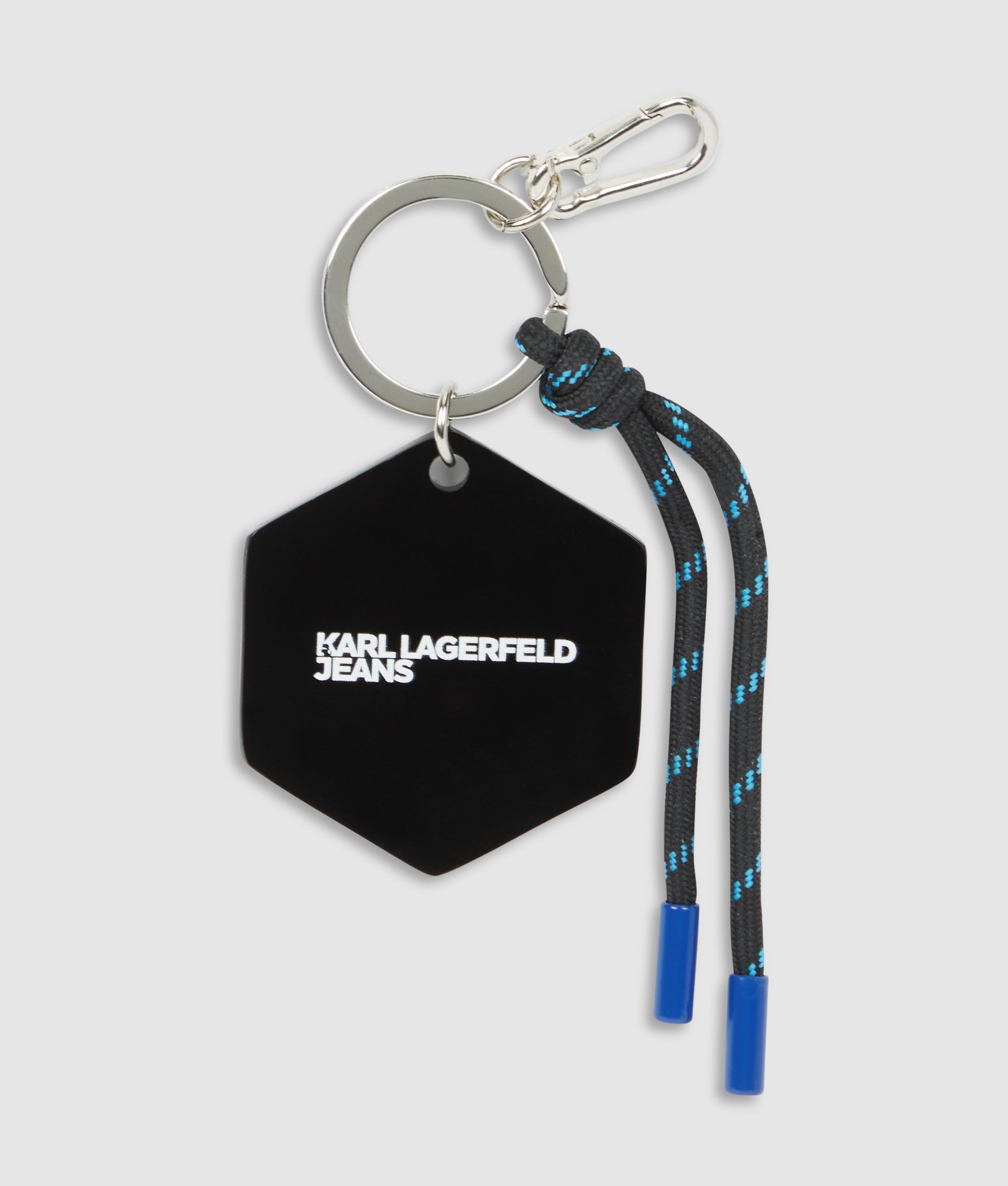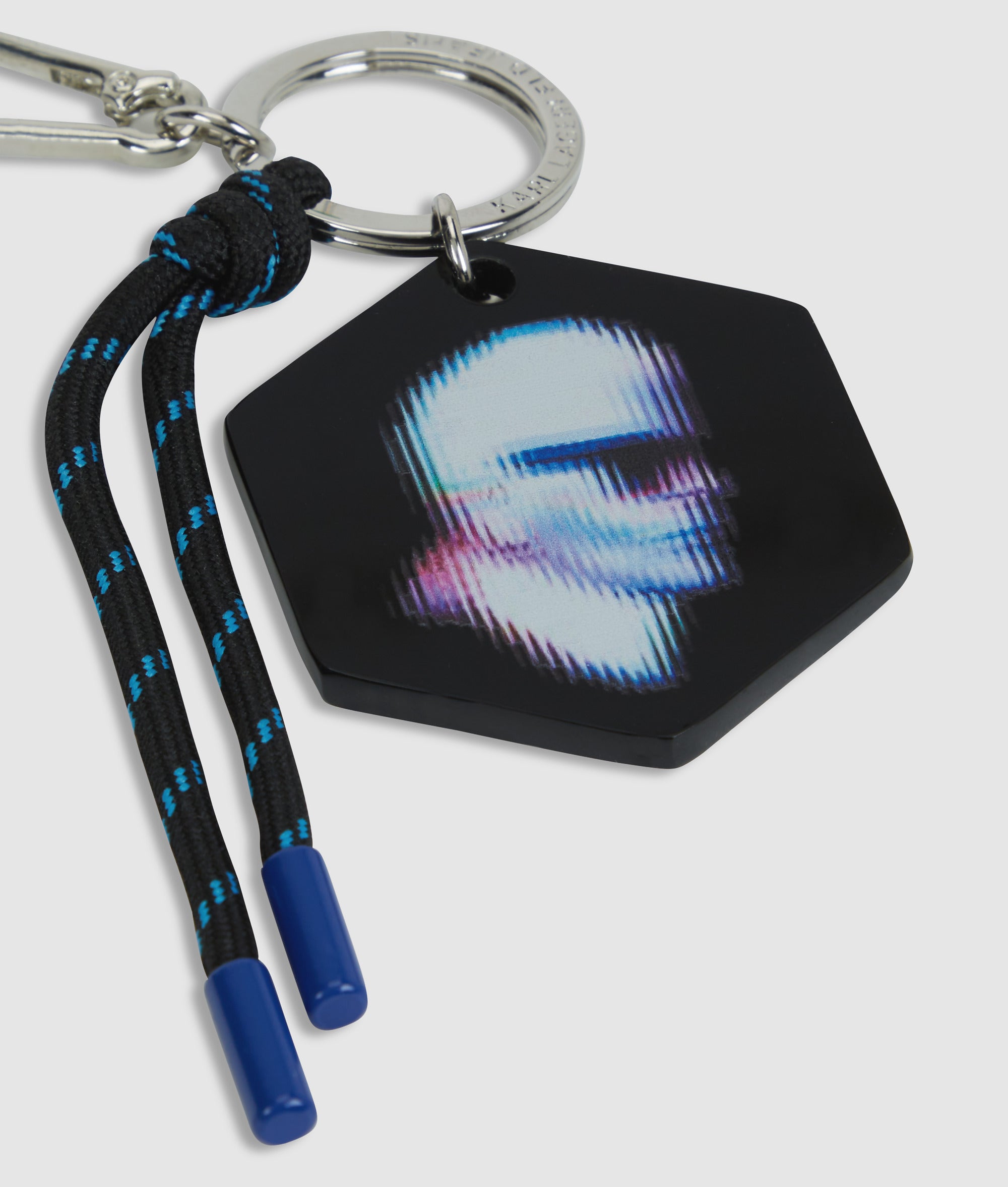 This statement keychain pairs resin-enriched cords with a hexagonal charm featuring a bold glitch graphic in homage to Karl Lagerfeld. Secure fastenings ensure essentials are easily at hand.