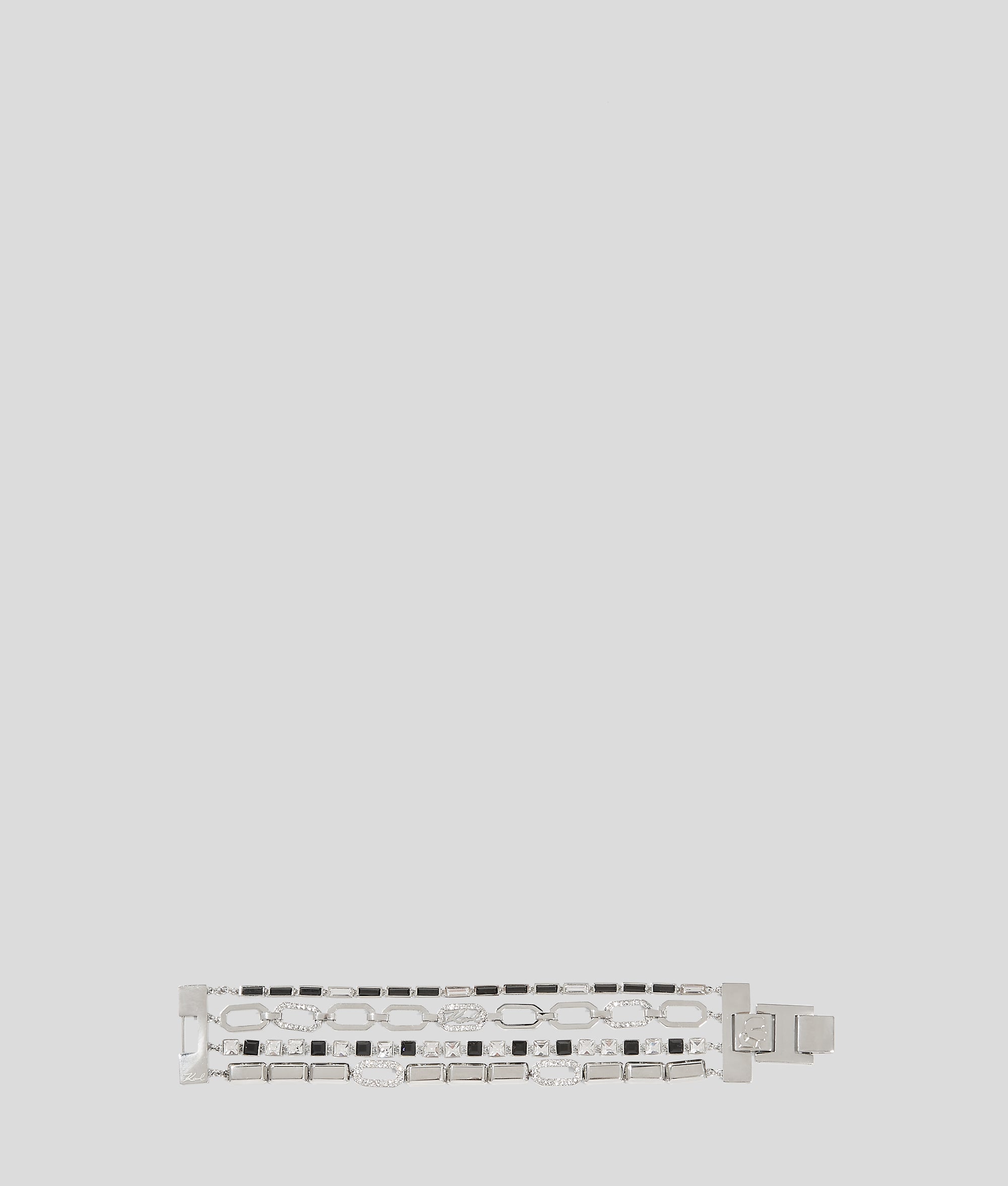 Embrace a stunning blend of elegance and edge with this four-tiered bracelet. showcasing a captivating mix of black baguette and black and white square-cut stones. Embellished with pav?? crystal charms and the iconic KARL Signature logo. it’s the perfect finishing touch for evening ensembles.