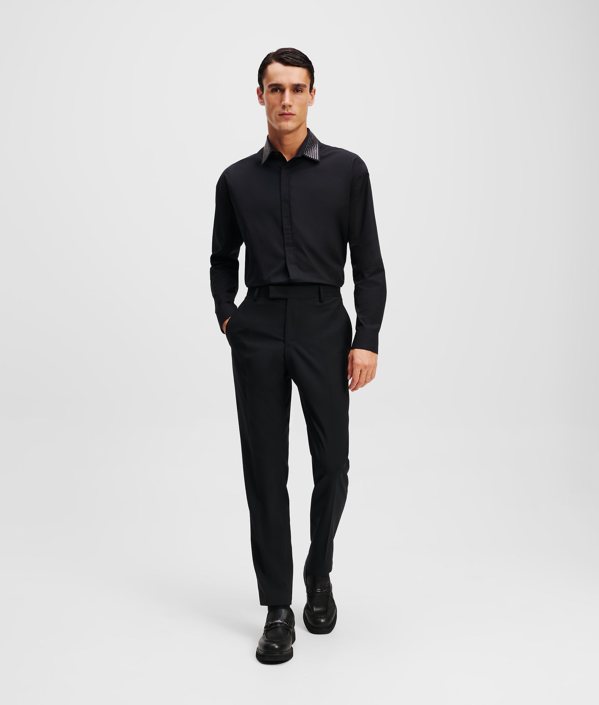A striking twist on a classic. this shirt features a statement studded collar that commands attention. The concealed button fastening ensures a sleek look. while the tonal KARL LAGERFELD embroidery adds a refined touch.