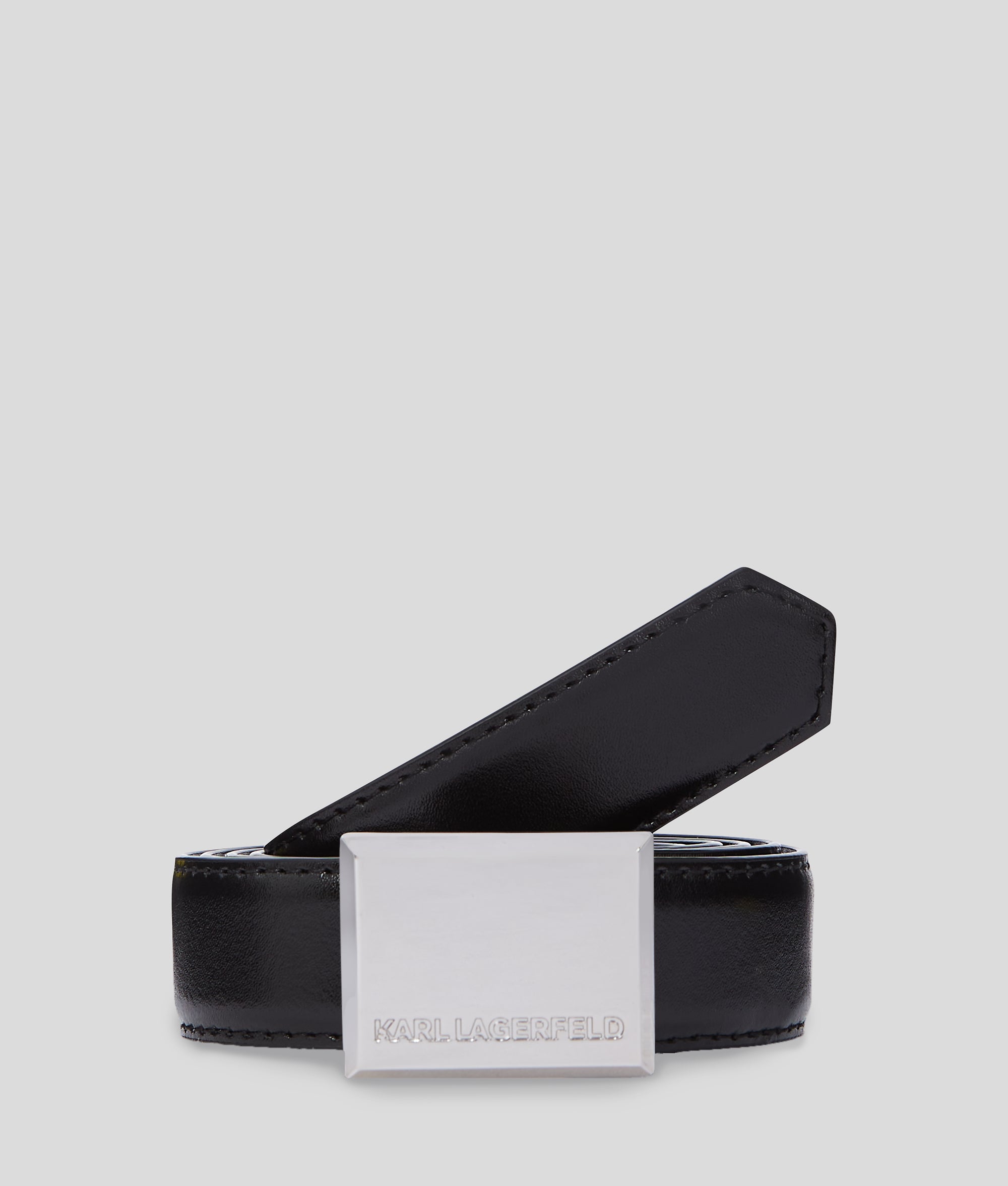 This luxe leather belt showcases a refined pin buckle closure and a square metal buckle adorned with the KARL LAGERFELD logo. Designed to harmonize seamlessly with the K/Forever collection. it exudes effortless style and sophistication.