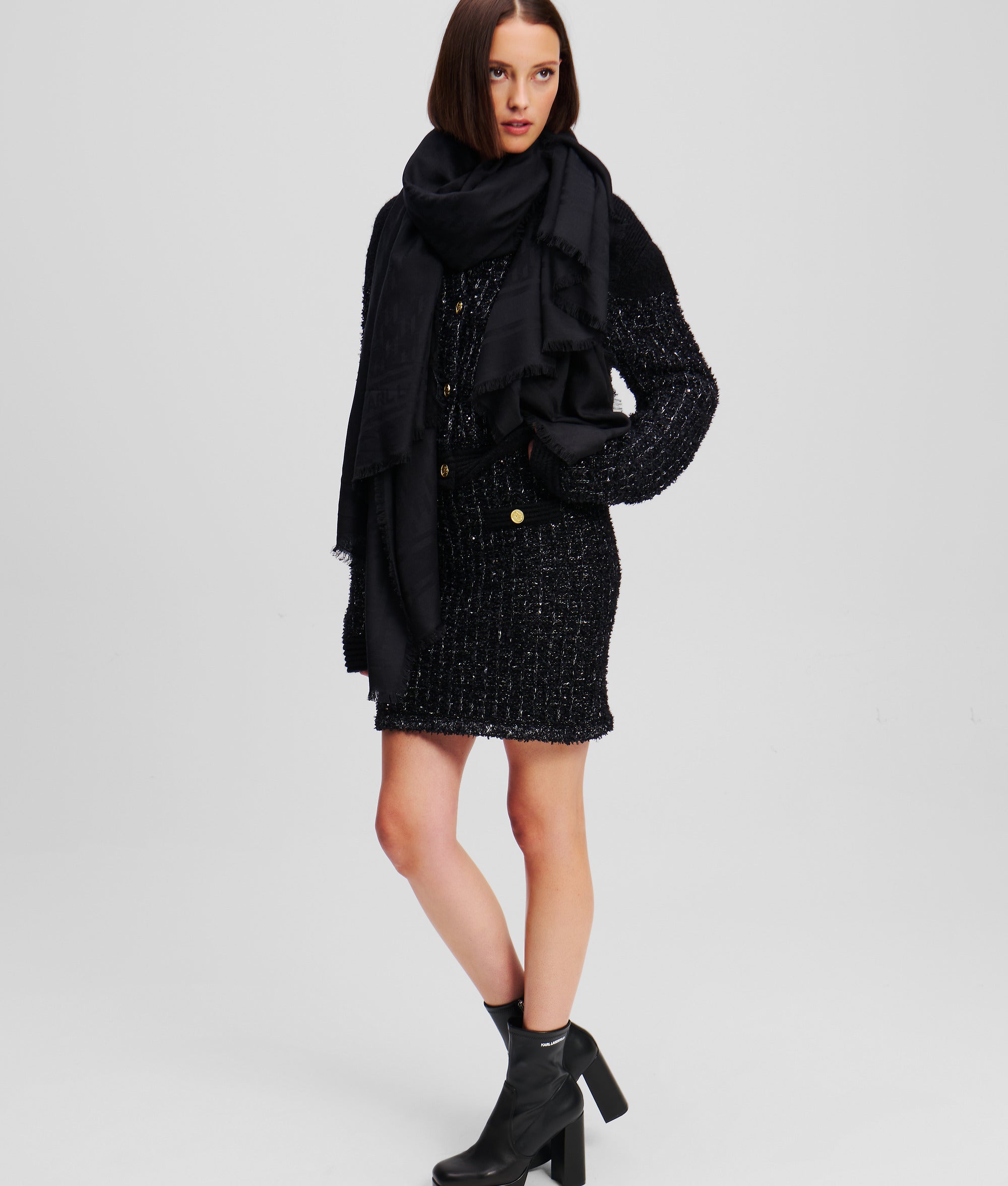 Wrap yourself in warmth with this exquisite scarf. featuring fringed edges and an all-over KARL Monogram design. The logo elegantly adorns the outer border. adding a touch of sophistication.