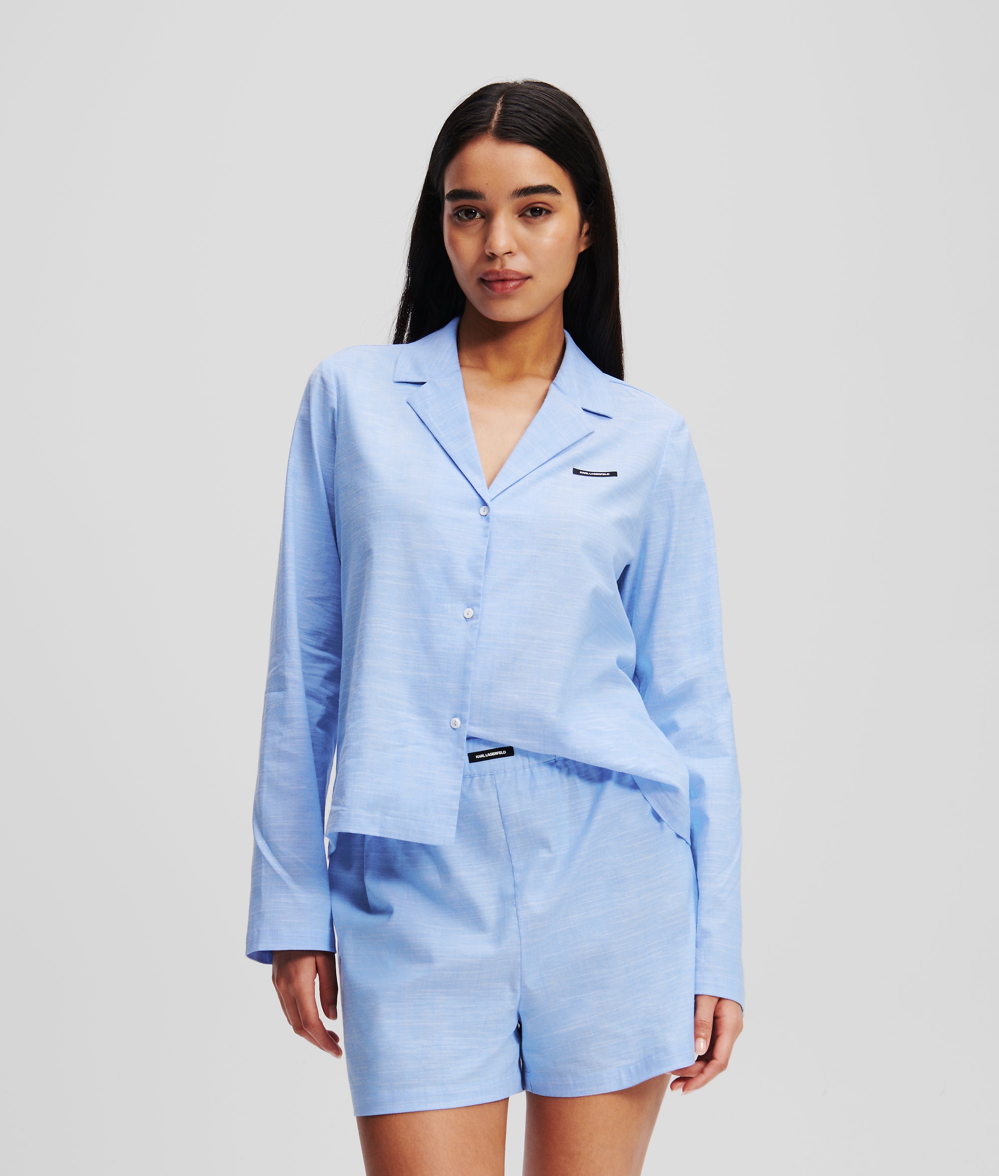 Comfort meets sophistication in this two-piece pajama set. featuring a long-sleeved shirt with a classic collar and button fastenings. The shorts offer an elasticated waistband for a perfect fit. while the iconic KARL LAGERFELD logo adds a touch of signature style.